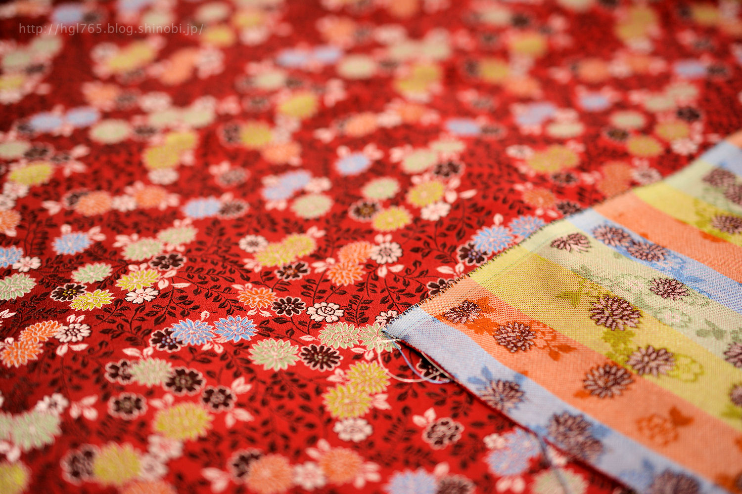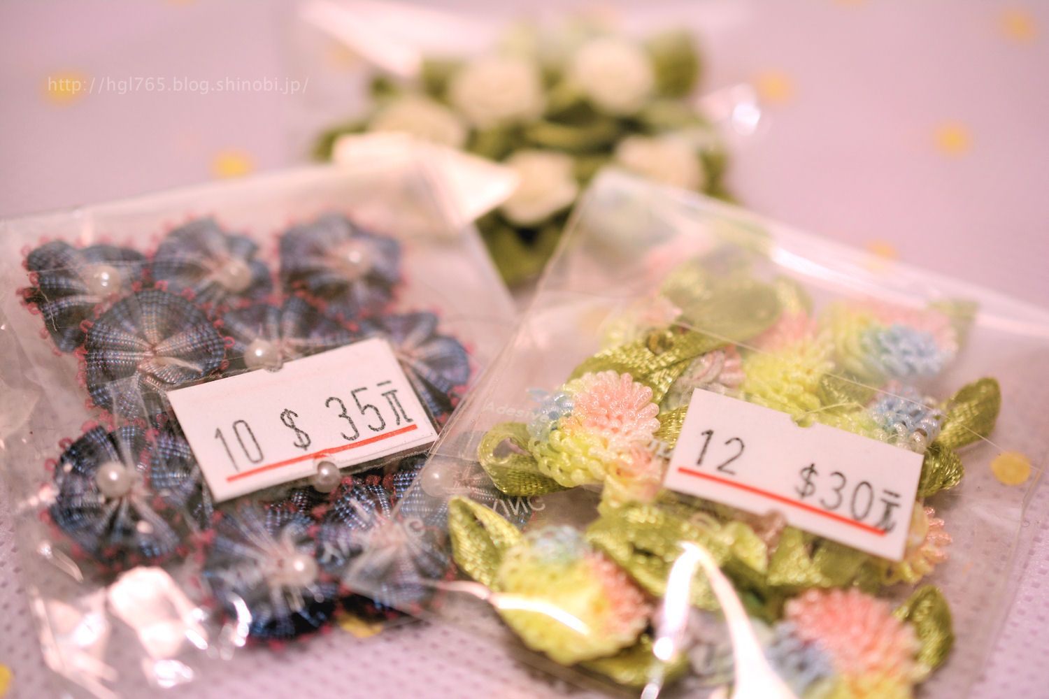 カーテンのブレードは1ヤード(約90cm)70元で、日本円にすると約250円。値段表示がないものも多いので、店員さんに尋ねる必要あり。花のパーツもたくさんありましたよ。1袋大体30~35元くらい。さらに別の店先の「2碼300元」のコーナーに、袋入りで並べられていたYOSAGEな布は300元(約1,050円)でした。1ヤード当たり約525円。